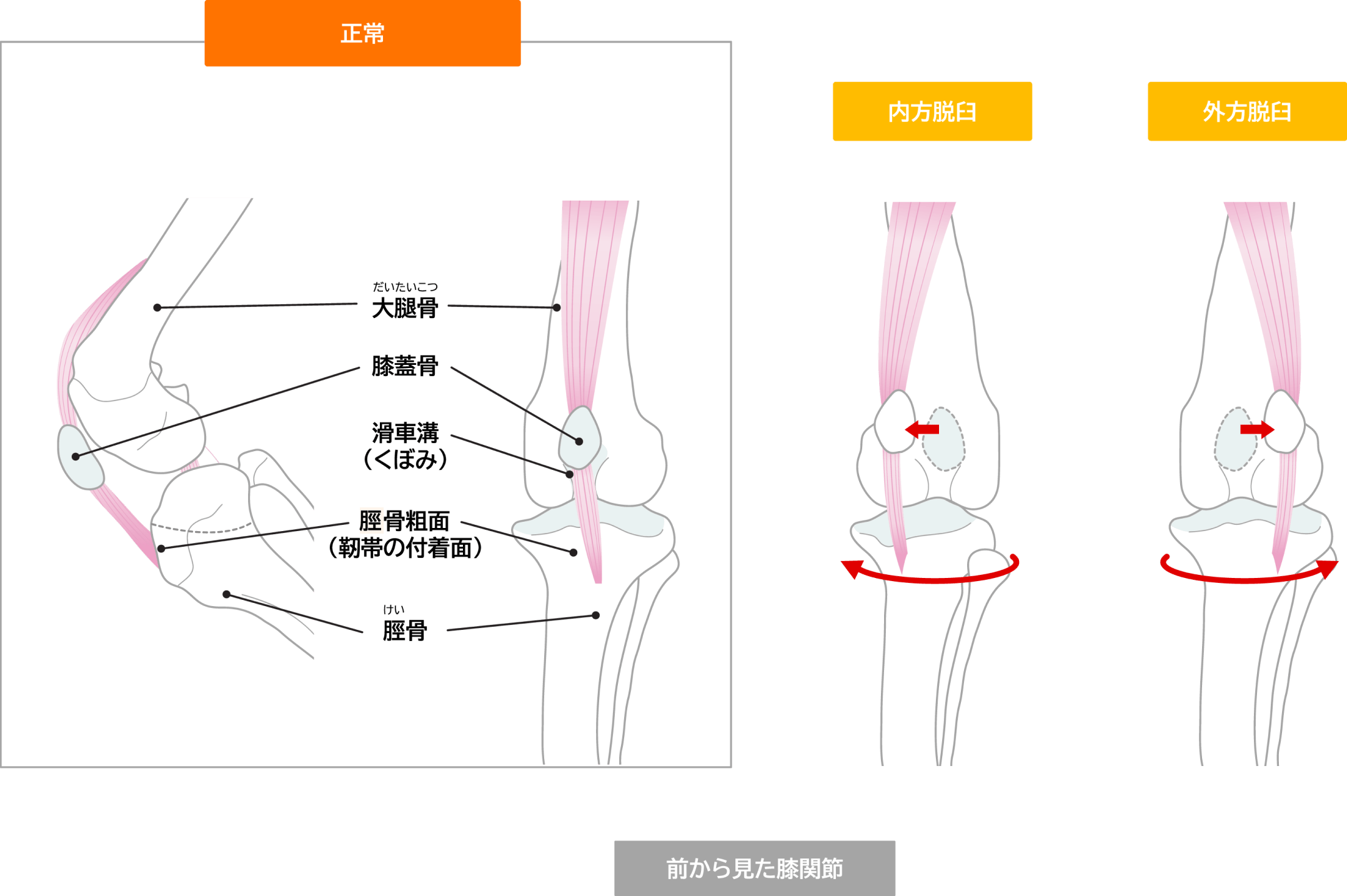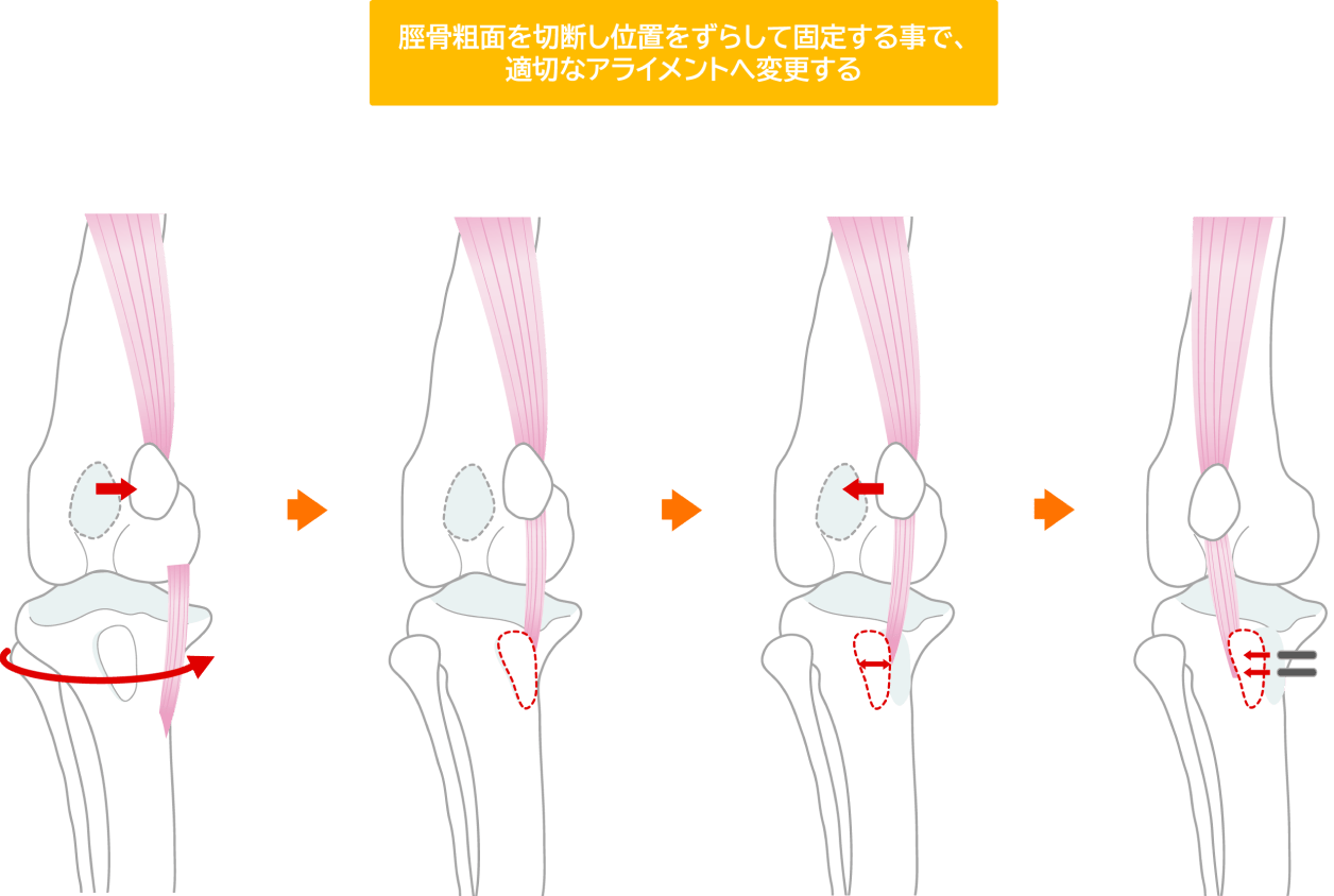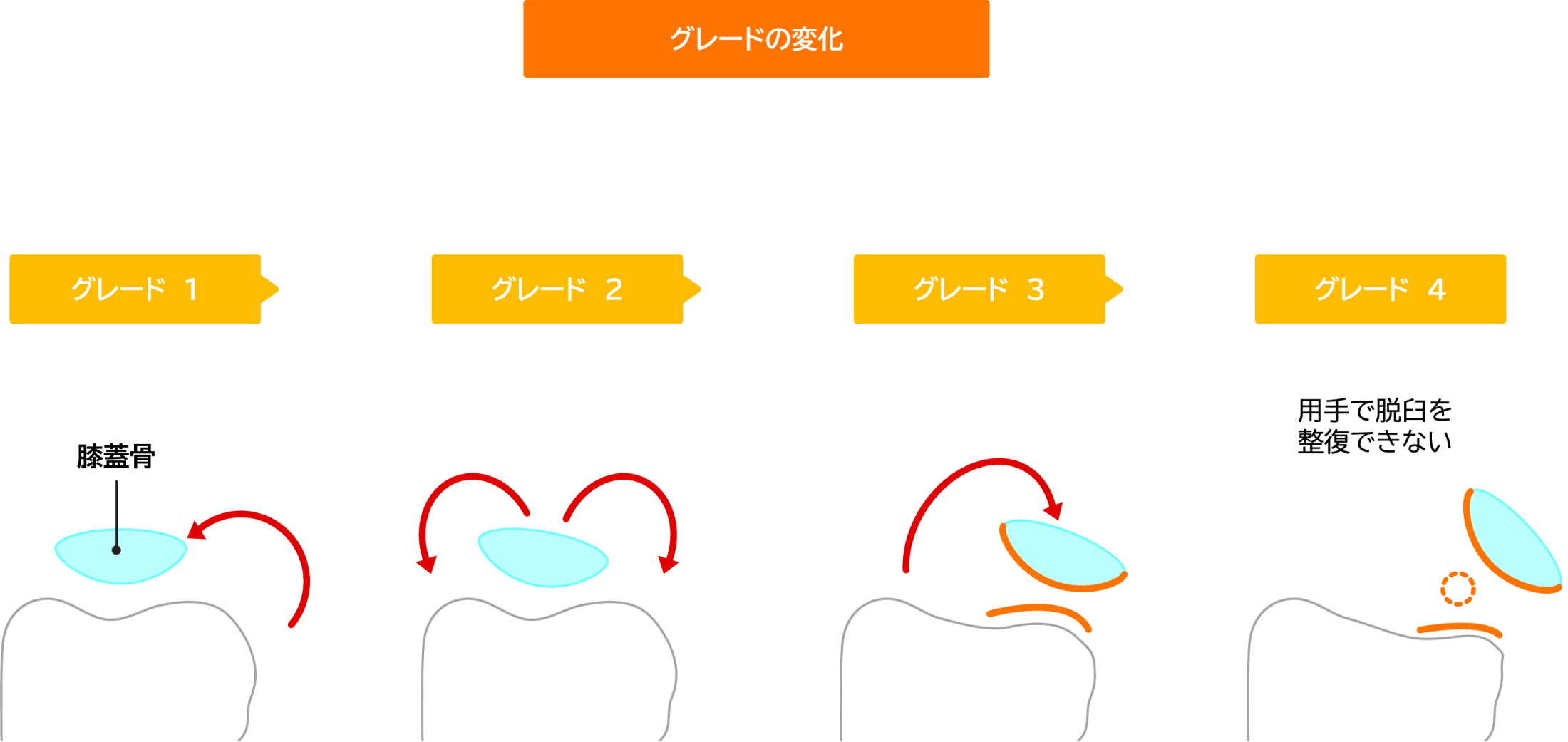 時間の経過とともに軟骨が摩耗しやすく、また年齢を重ねるほど、関節炎などを伴うことにより手術による治療効果が下がってしまいます。そのため、外科的治療は若いうちに実施することをお勧めしております。特にグレードが高い場合に関しては骨や関節の変形を誘発することがありますので、推奨されます。
