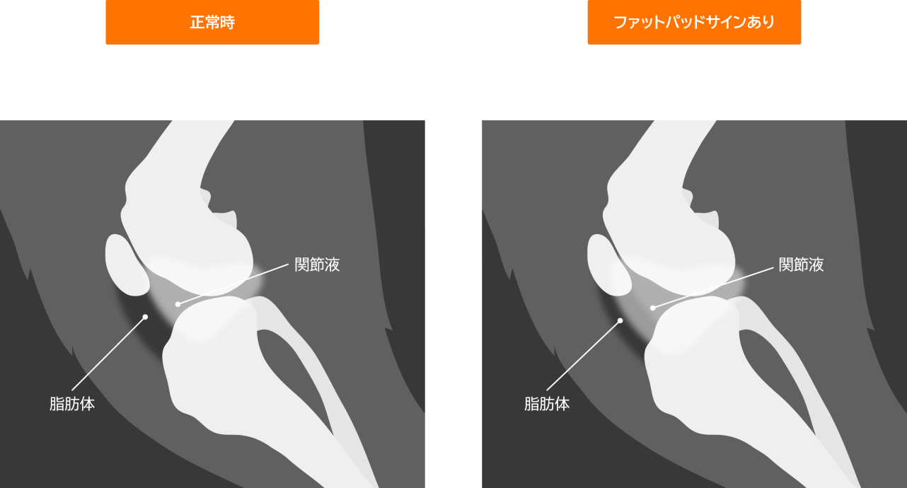 以前と同じ膝蓋骨内方脱臼グレードは2でしたが、右後肢を少し曲げるだけで膝蓋骨の内方脱臼を認め、以前よりも明らかに外れやすくなっていました。また、膝蓋骨を指で動かすと、ガリガリとした感触を伴い、関節軟骨の摩耗したものと推測されました。